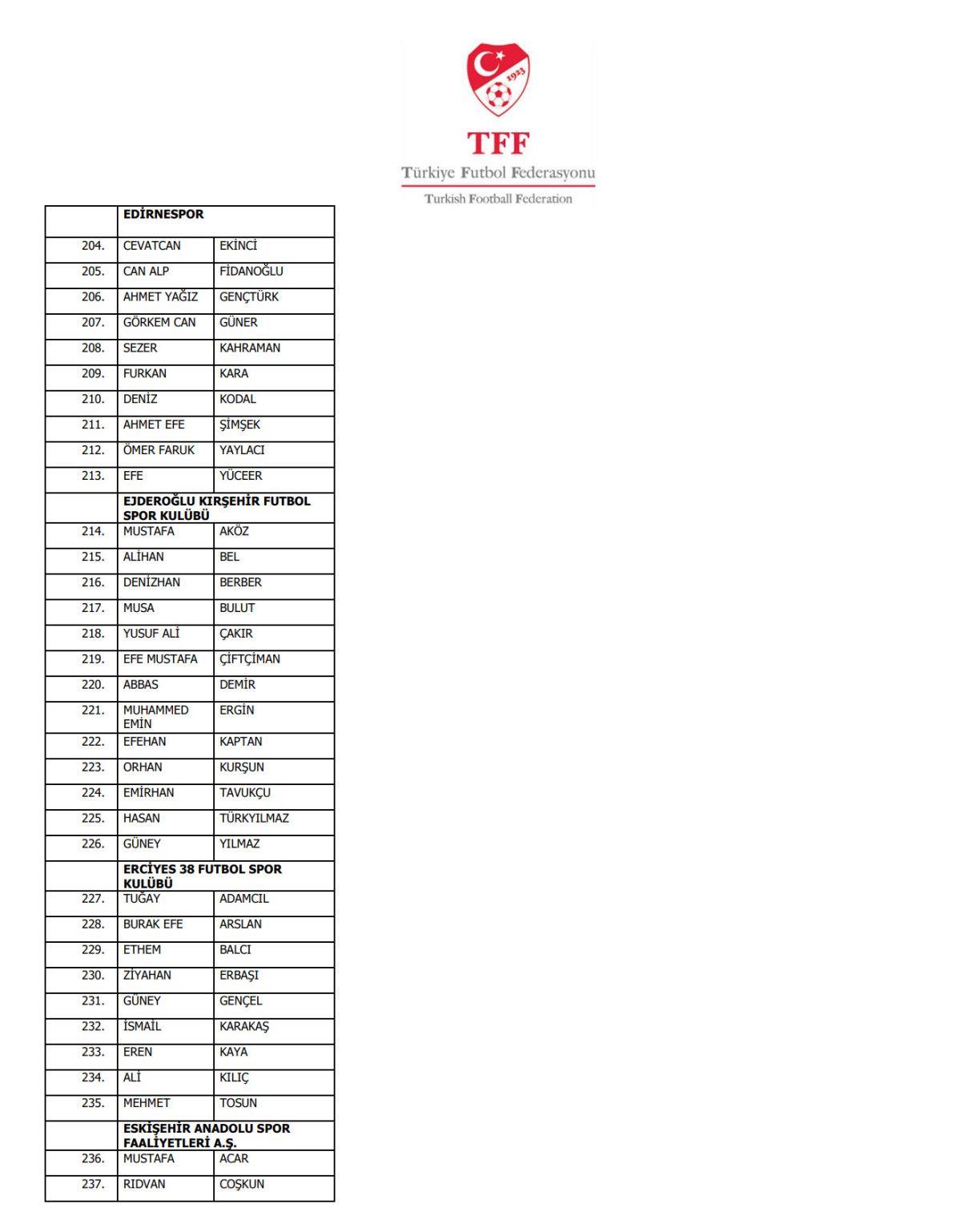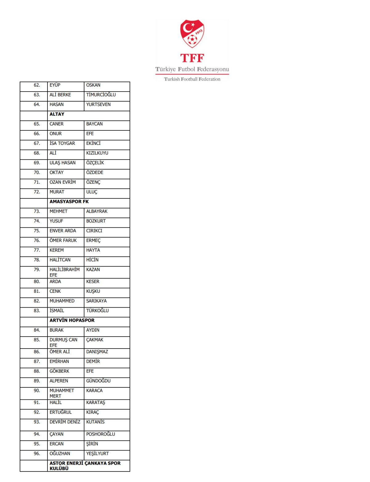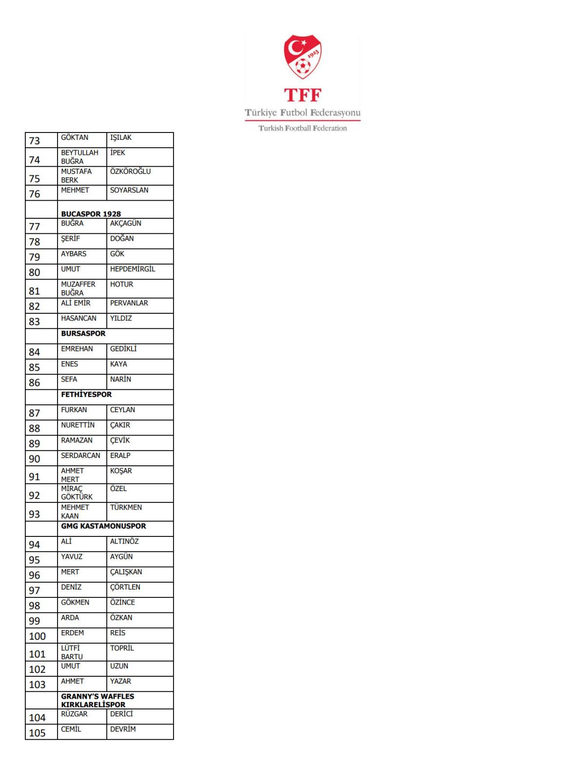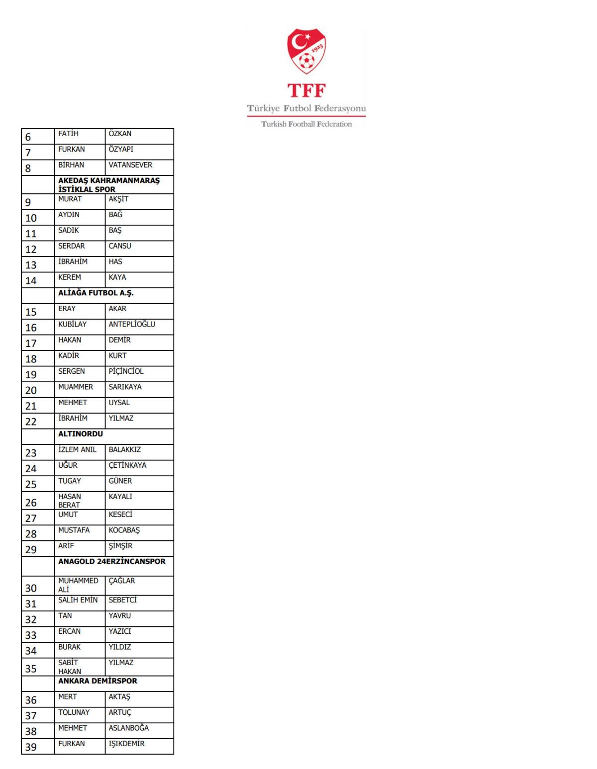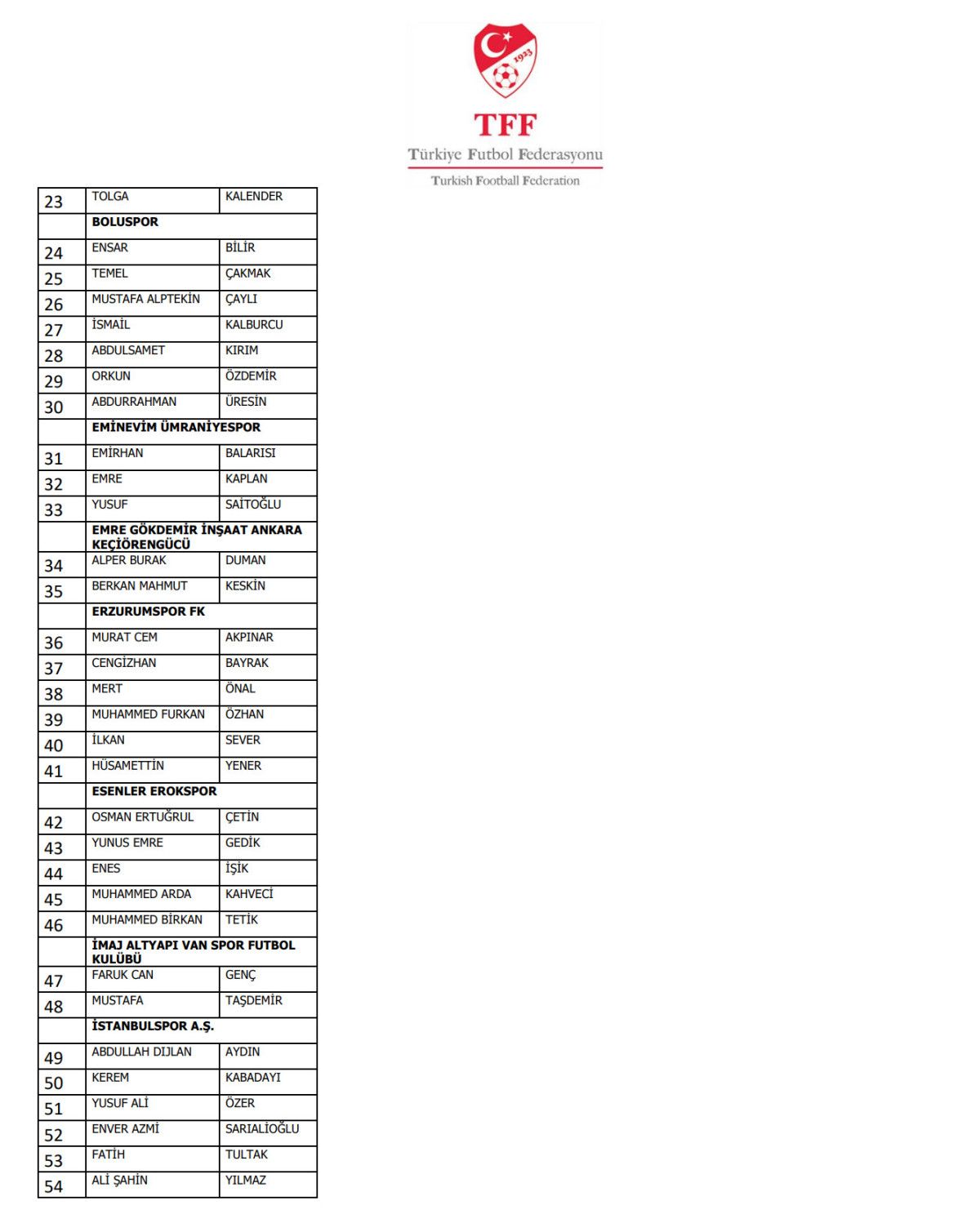 İsmi açıklanan futbolcular arasında Boluspor’dan Ensar Bilir, Temel Çakmak, Mustafa Alptekin Çaylı, İsmail Kalburcu, Abdulsamet Kırım, Orkun Özdemir ve Abdurrahman Üresin’in ismi yer aldı.