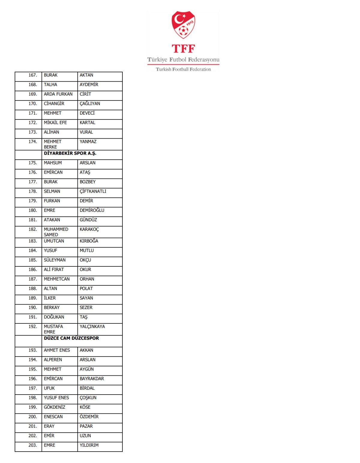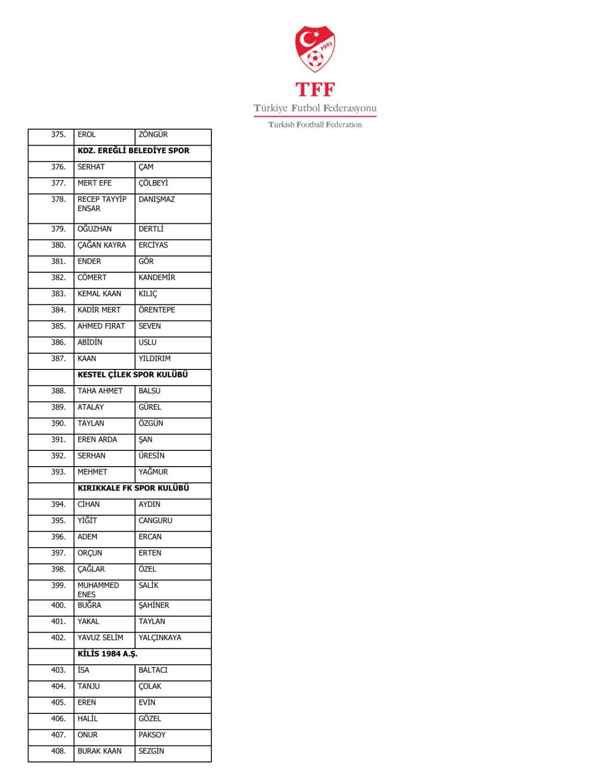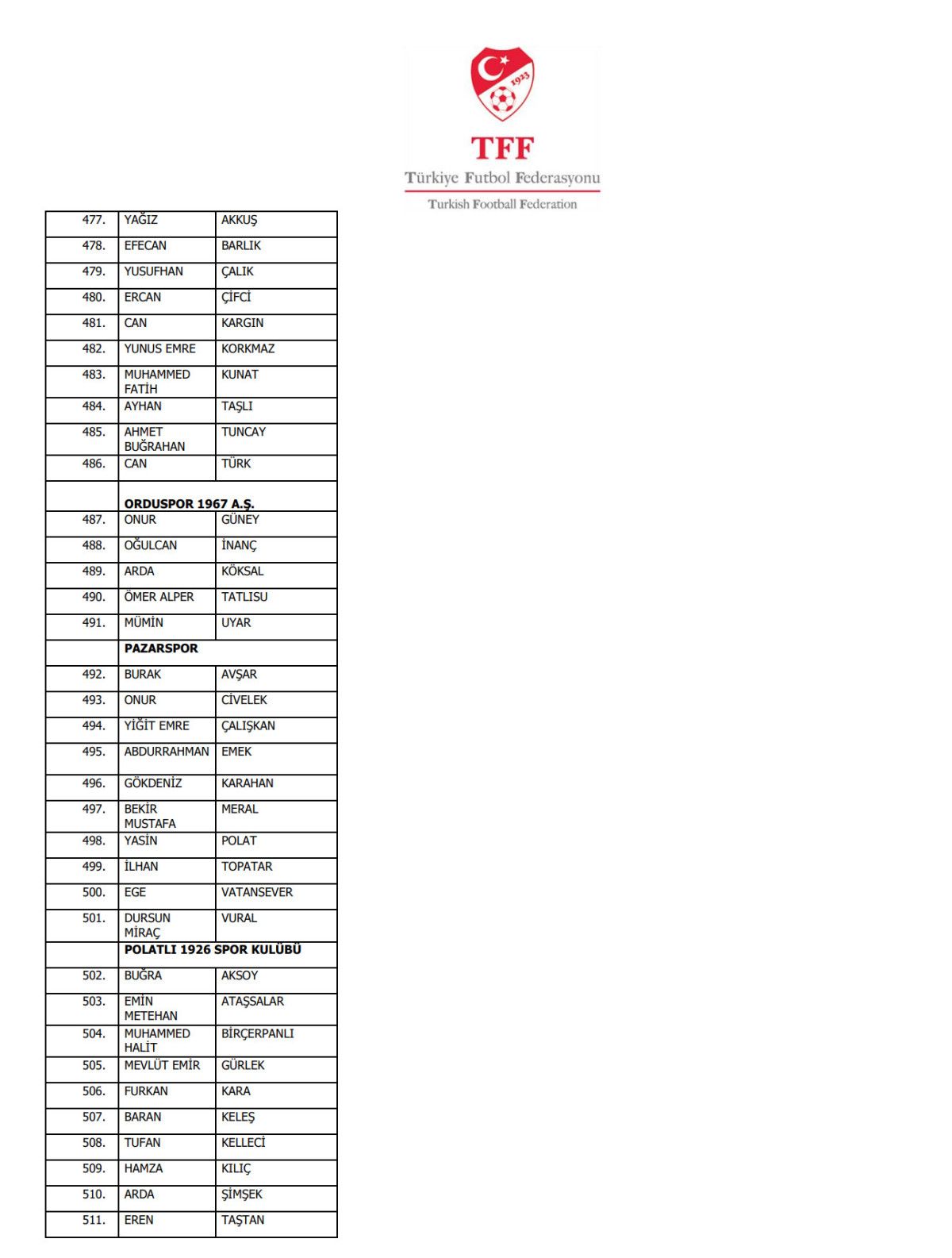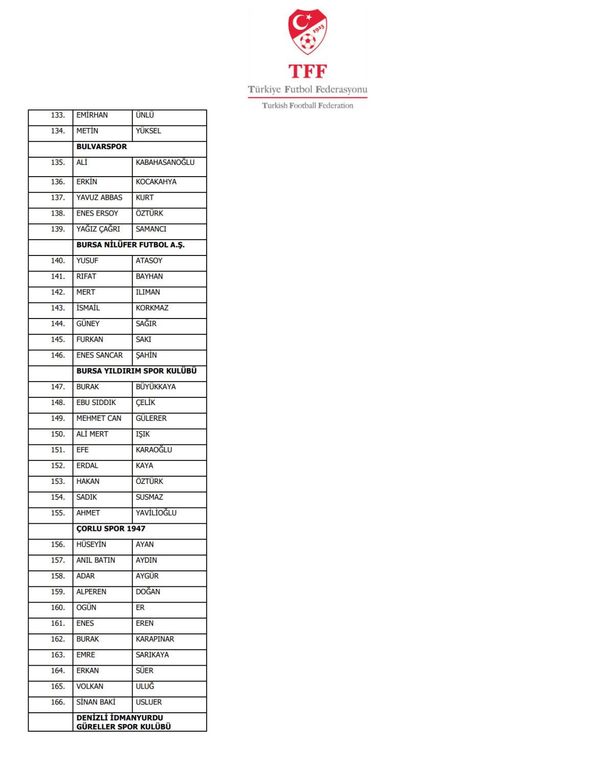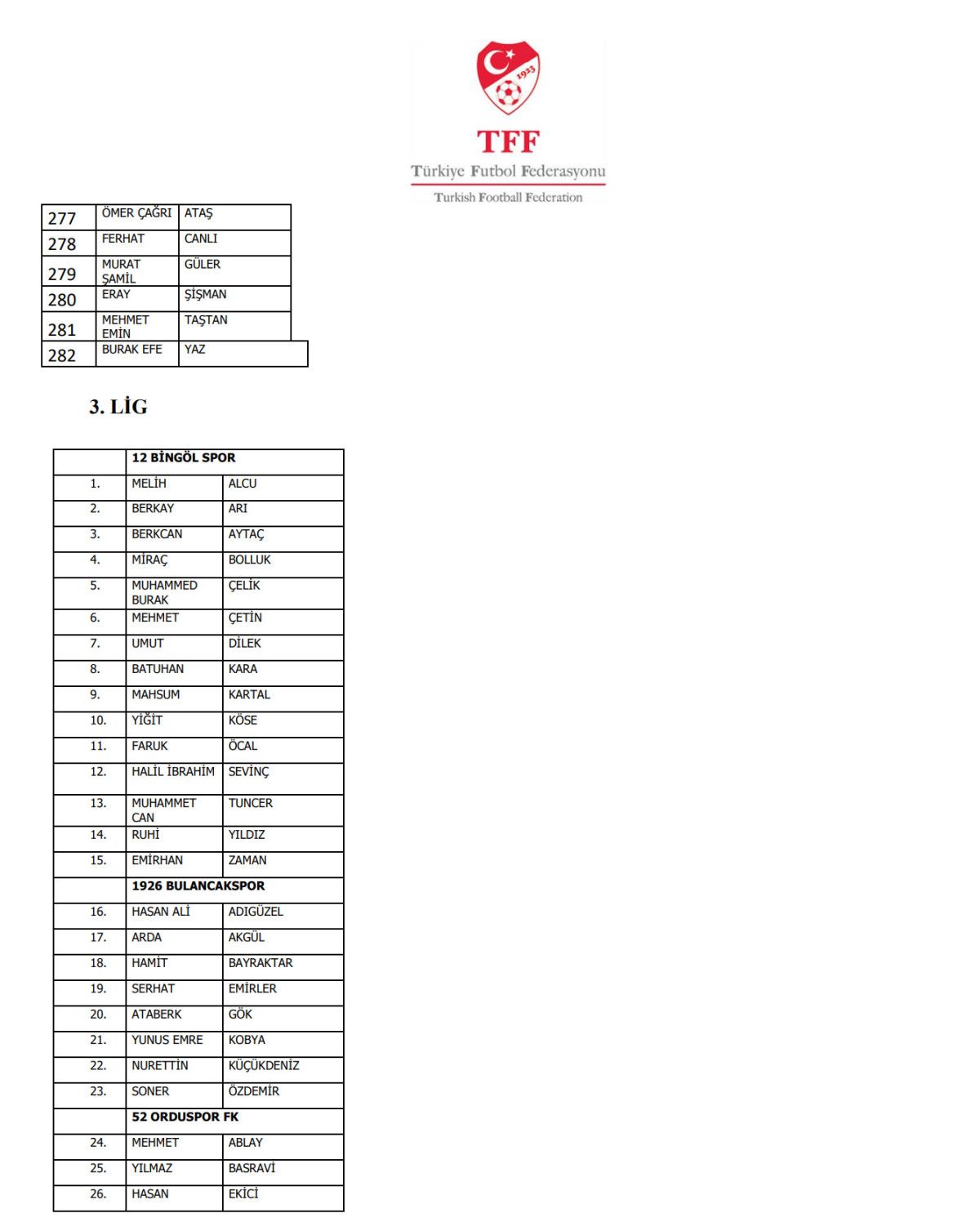 İsmi açıklanan futbolcular arasında Boluspor’dan Ensar Bilir, Temel Çakmak, Mustafa Alptekin Çaylı, İsmail Kalburcu, Abdulsamet Kırım, Orkun Özdemir ve Abdurrahman Üresin’in ismi yer aldı.