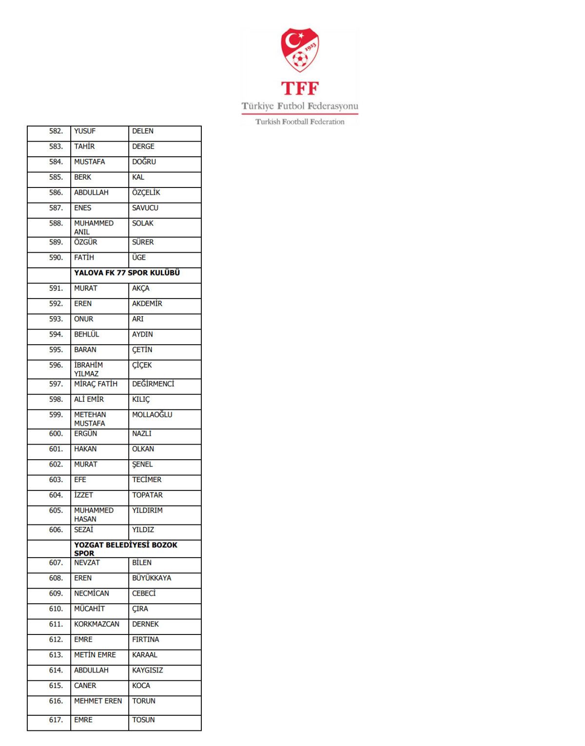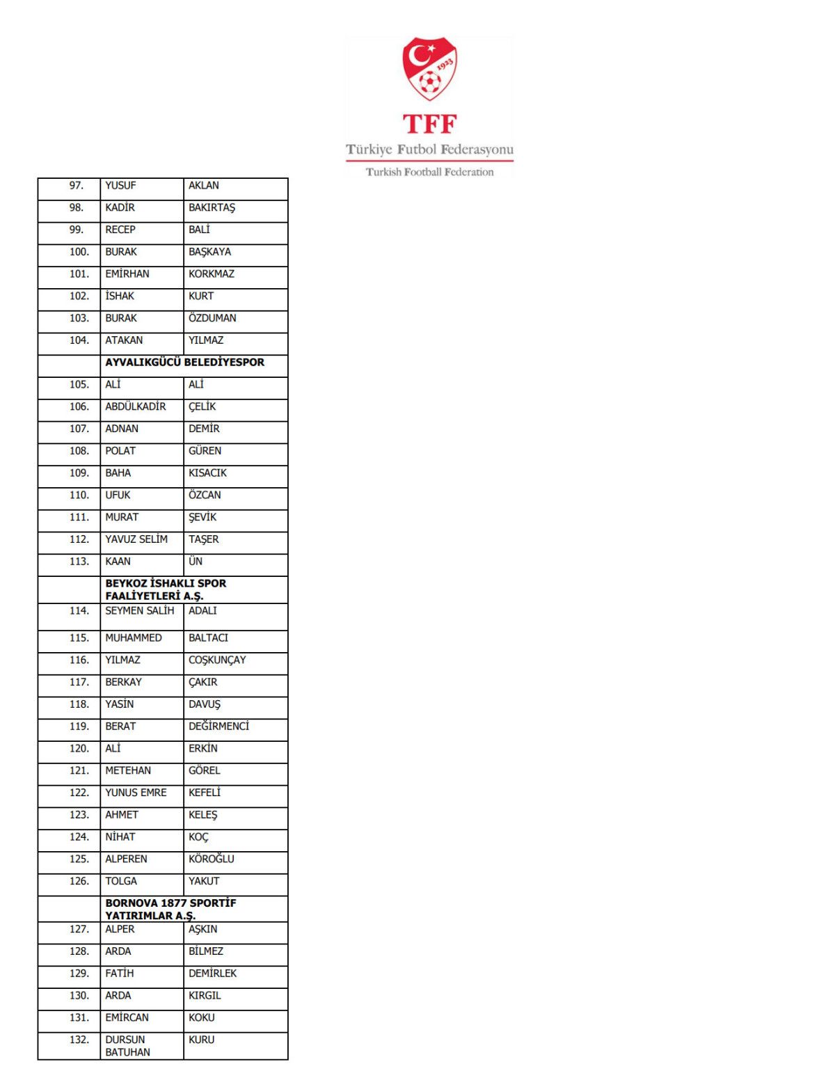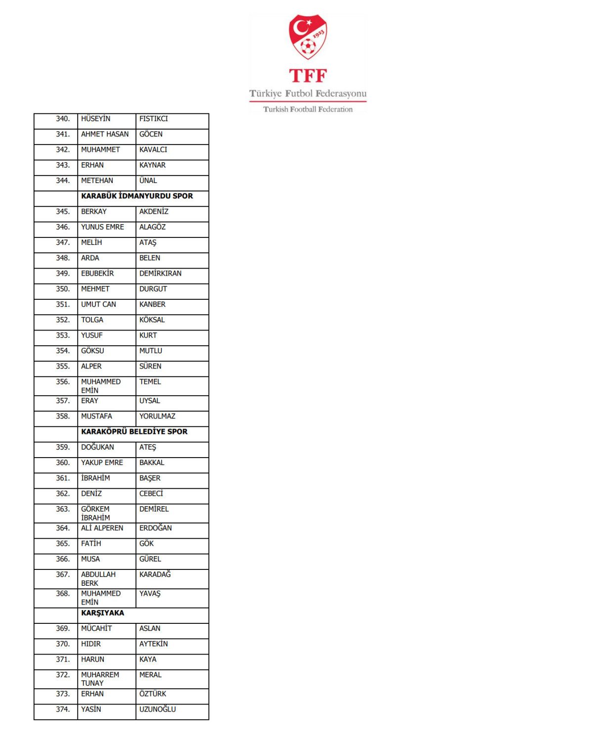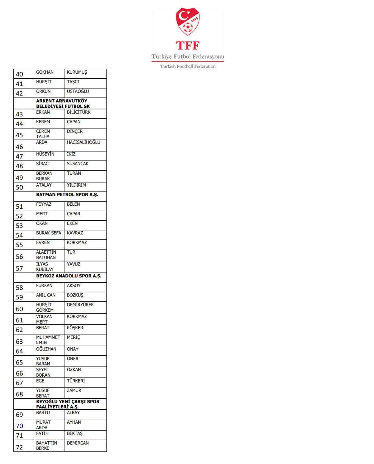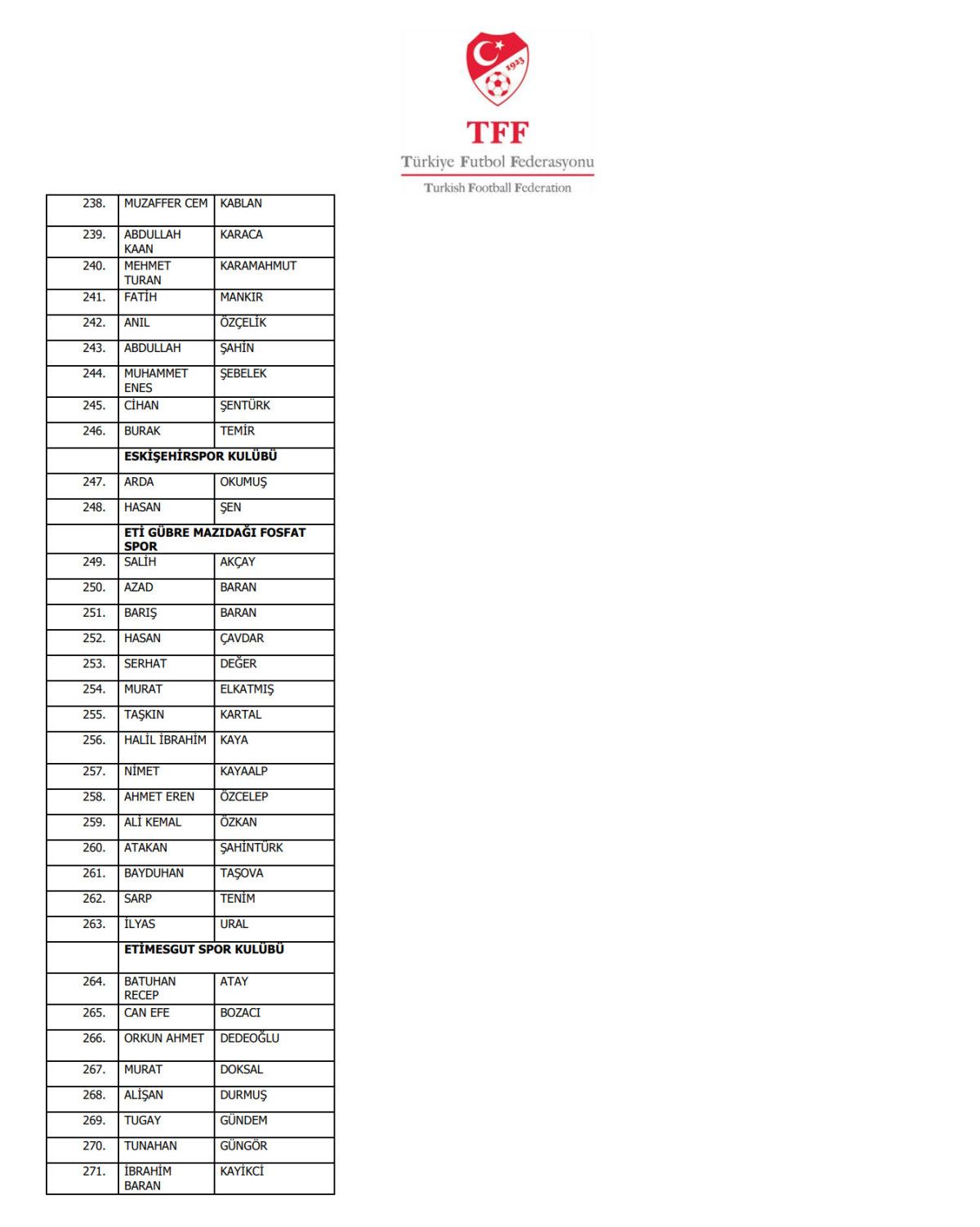İsmi açıklanan futbolcular arasında Boluspor’dan Ensar Bilir, Temel Çakmak, Mustafa Alptekin Çaylı, İsmail Kalburcu, Abdulsamet Kırım, Orkun Özdemir ve Abdurrahman Üresin’in ismi yer aldı.