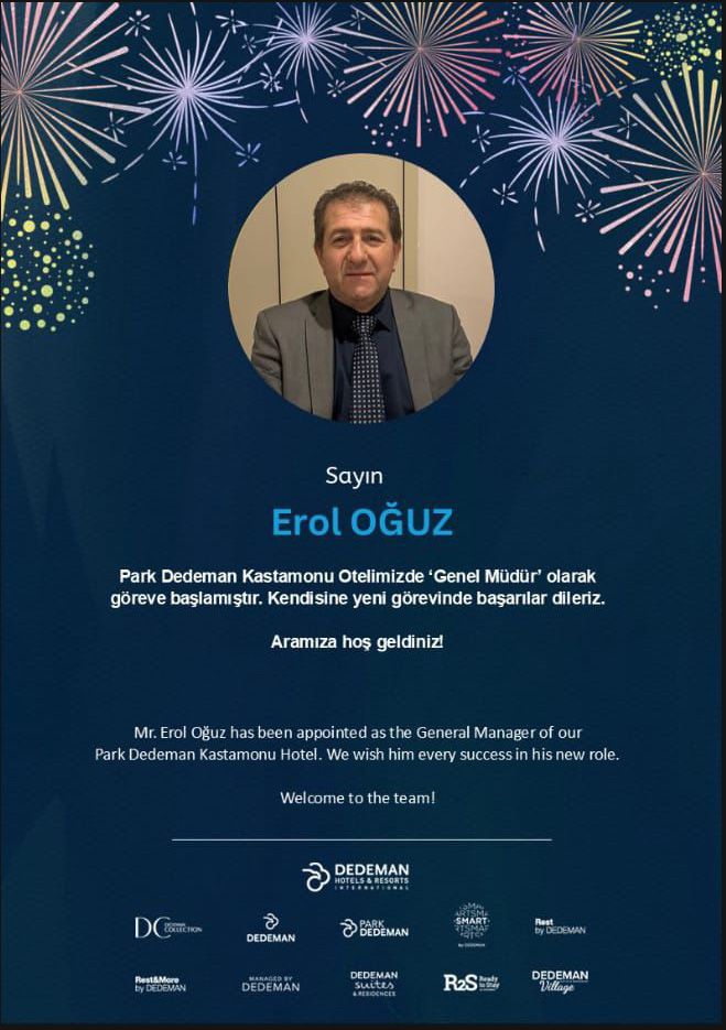 Erol Oğuz, uzun yıllar boyunca Bolu ve çevresindeki otellerde genel müdürlük — yöneticilik pozisyonlarında görev aldı. Turizm sektöründeki birikimi ve liderlik deneyimi göz önüne alınarak, Park Dedeman Kastamonu’nun genel müdürü olarak görevlendirildi. Bu atama ile Dedeman’ın bölgedeki yeni otel yatırımına, güçlü ve tecrübeli bir kadro ile başlama kararlılığı vurgulanmış oldu.